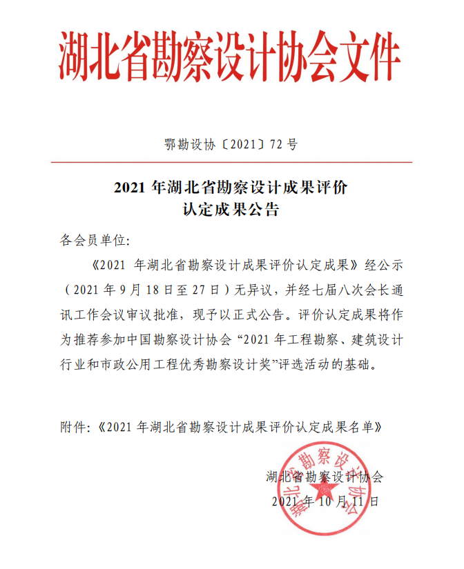 10月11日,湖北省勘察設計協會正式發布《2021年湖北省勘察設計成果評價認定成果公告》,公司實施的5個項目分別榮獲工程勘察組一二三等獎。
