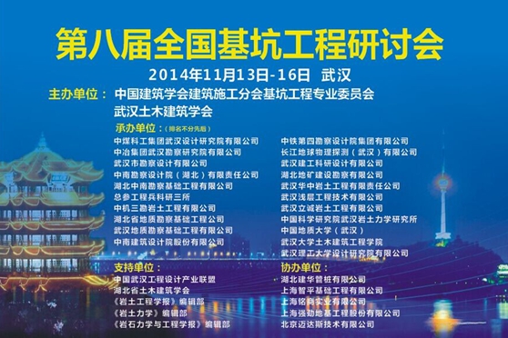 2014年11月14日,第八屆全國基坑工程研討會在武漢市洪山賓館隆重召開。此研討會每兩年舉辦一次,是國內基坑工程技術專業的頂級交流活動。本次大會共有來自全國各地的行業精英700余人參加,并邀請到龔曉南、劉祖德、范士凱、顧金才、黃強、唐雨耕、宋二祥、鄭剛、王衛東、徐武建、彭浩、張曠成等工程院院士、全國頂尖大師、知名學者及重要領導作為與會嘉賓,大家齊聚一堂,共襄盛會。