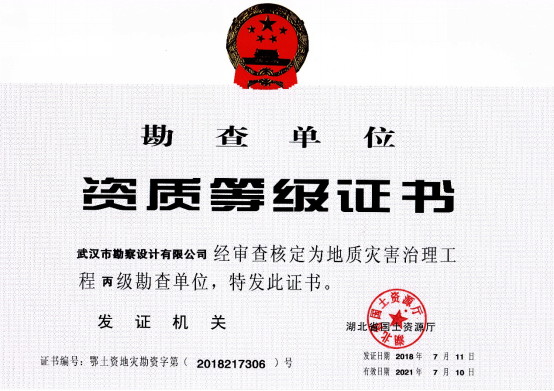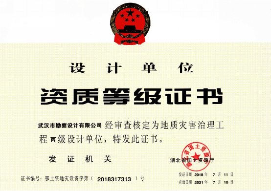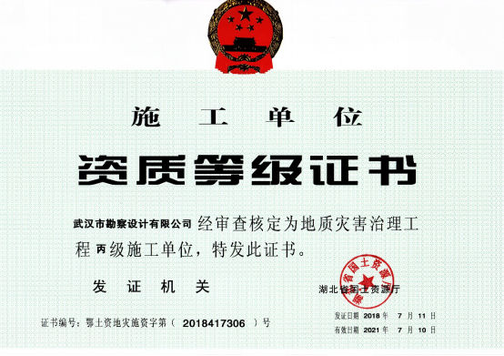 近日,湖北省國土資源廳發(fā)布了關于2018年度地質災害危險性評估和治理工程資質(新立、升級)審批結果的公告,公司地質災害危險性評估和地質災害治理工程勘查、設計、施工資質申請一次性順利通過國土資源部審核,并成功取得了資質證書。